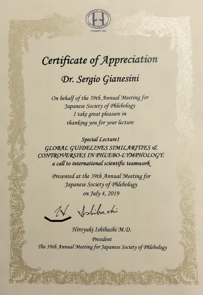 In data 4 luglio, Gianesini ha ricevuto il “certificato di apprezzamento” da parte della Società Giapponese di Flebologia. La cerimonia è avvenuta in occasione del 39esimo congresso nazionale della prestigiosa organizzazione scientifica nipponica, in seguito alla lettura magistrale tenuta dallo stesso Gianesini sul lavoro di revisione internazionale delle linee guida internazionali in flebo-linfologia.