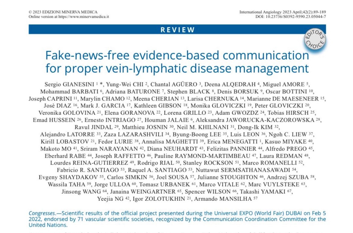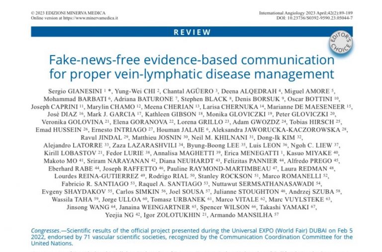 Dopo un anno di lavoro, è stato pubblicato il documento di consenso contro le fake news e la misinformazione in campo venoso e linfatico. Il progetto ha coinvolto più di 70 società scientifiche e più di 80 paesi da tutti i continenti ed è stato presentato da Gianesini all’Expo 2022, con encomio delle United Nations.